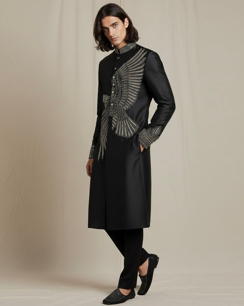 Black Embroidered Kurta for Men with Silver Detailing | Luxury Ethnic Wear